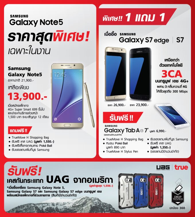 – เป็นเจ้าของ Samsung Galaxy Note5 ในราคาเพียง 13,900 บาท (จากราคาปกติ 21,900 บาท) เมื่อสมัครแพ็คเกจ 4G+ Super Smart 699 บาทขึ้นไป (ชำระค่าบริการล่วงหน้า 1,500 บาท ระยะสัญญา 12 เดือน)
